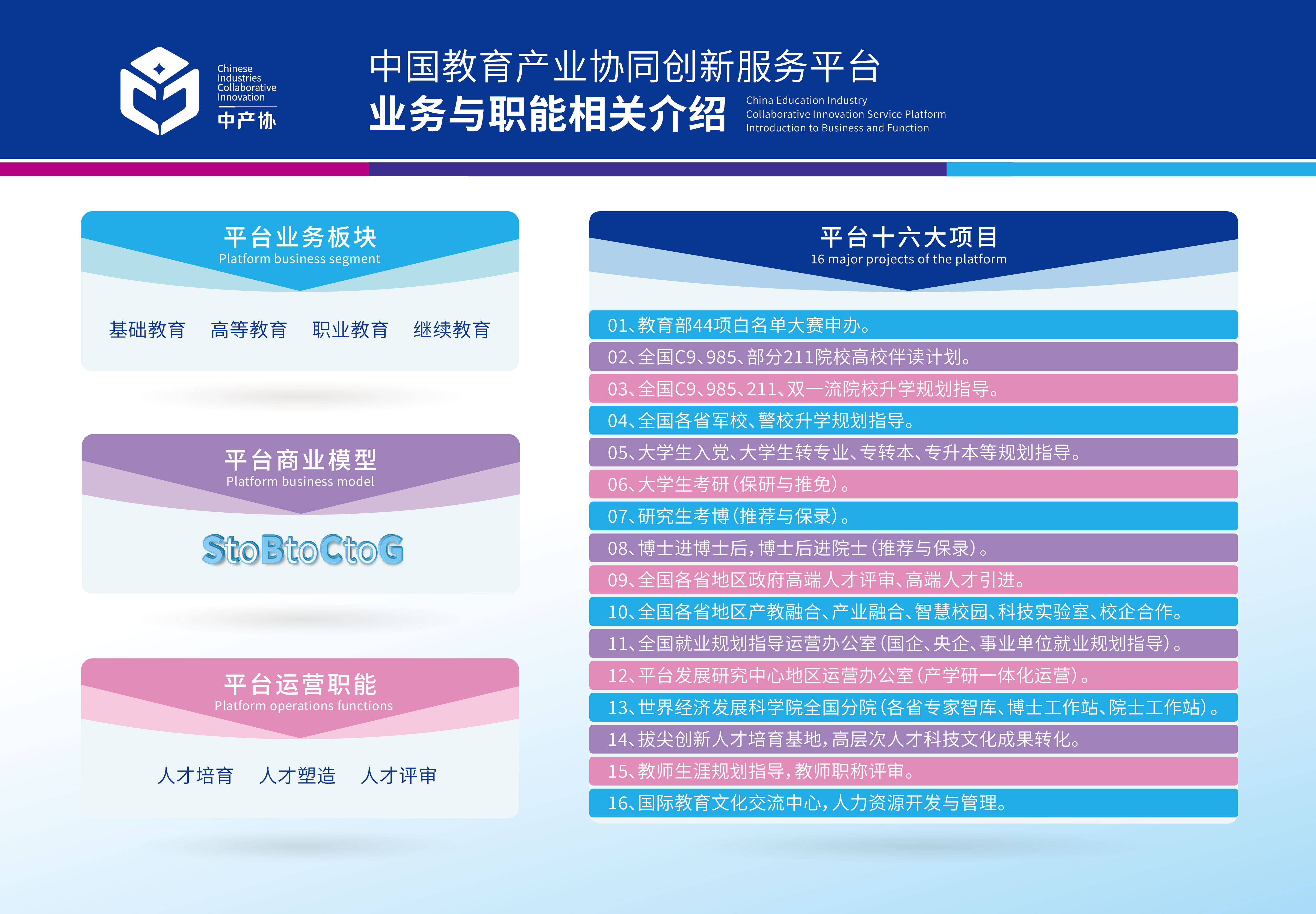 中国教育产业协同创新服务平台致力于促进教育领域的协同合作与创新发展。平台以人才培育、人才塑造、人才评审为运营职能,汇聚国内外近千名院士及万名博士组成专家智库团,着力培养中国式现代化拔尖创新型人才、标准化适用型人才、综合性复合型人才,全力打造创新人才培育及塑造机制,竭力建设高端人才科技文化成果转化系统。